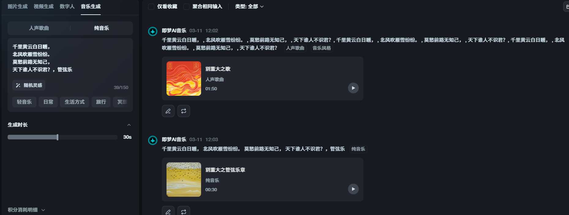 在音乐生成,纯音乐和人声音乐中输入文字,多复制几次获得足够的时长,也可使用天工音乐等平台生成。下载音乐备用。